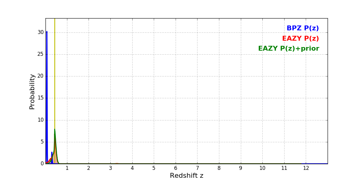 In P(z) plots: Yellow lines mark the cluster redshift z = 0.425,