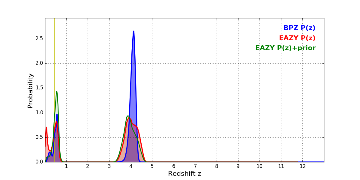 In P(z) plots: Yellow lines mark the cluster redshift z = 0.425,