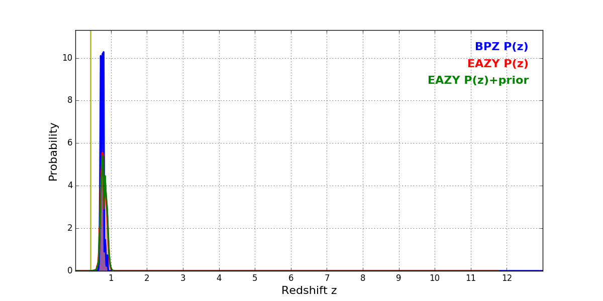 In P(z) plots: Yellow lines mark the cluster redshift z = 0.425,
