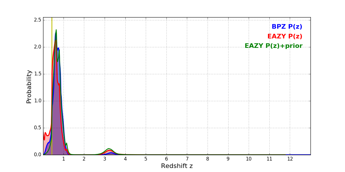 In P(z) plots: Yellow lines mark the cluster redshift z = 0.425,