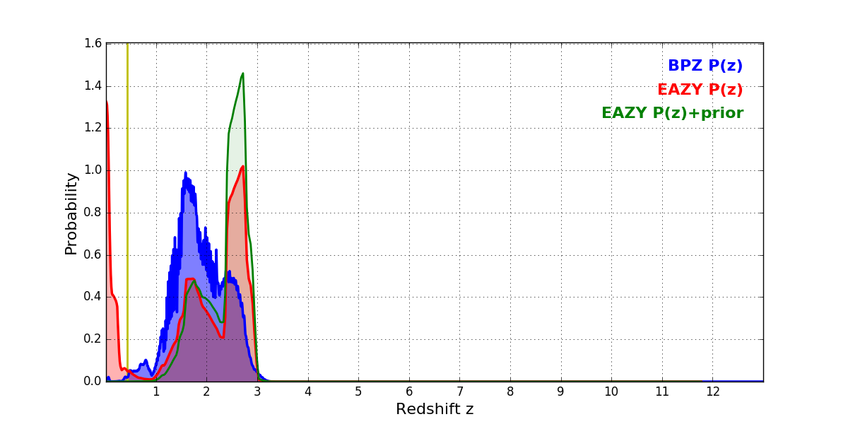 In P(z) plots: Yellow lines mark the cluster redshift z = 0.425,