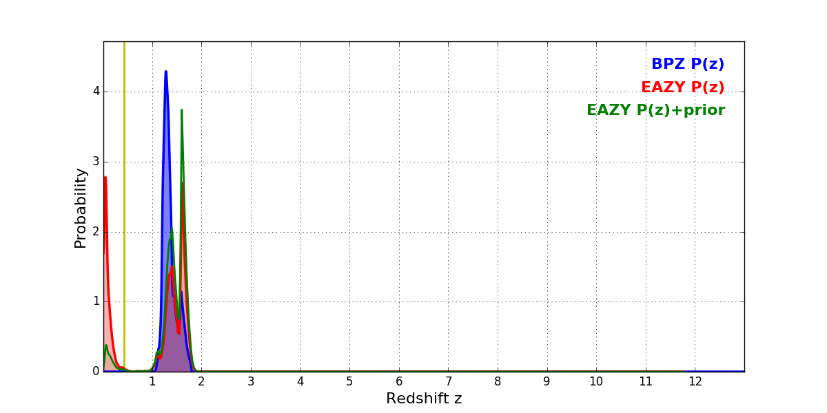 In P(z) plots: Yellow lines mark the cluster redshift z = 0.425,
