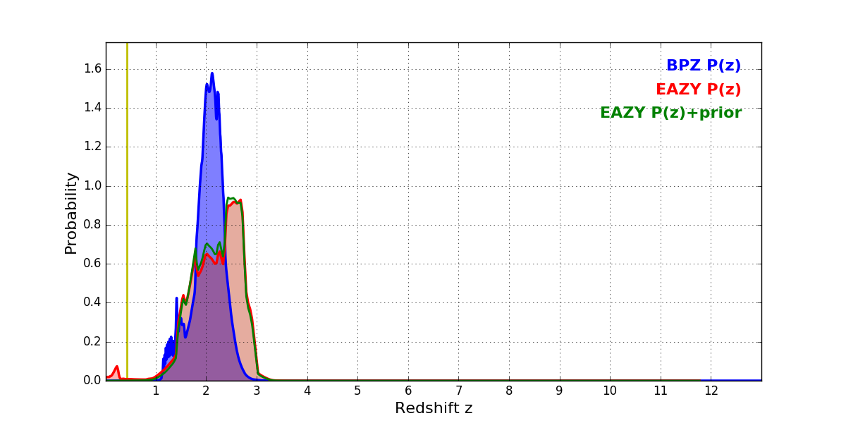 In P(z) plots: Yellow lines mark the cluster redshift z = 0.425,