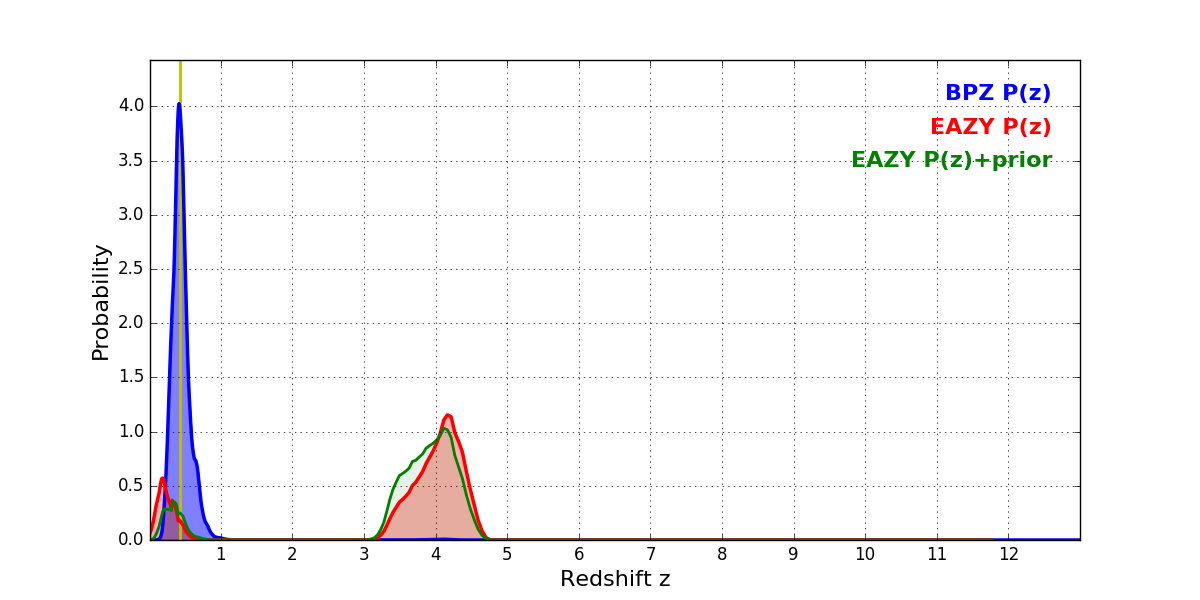 In P(z) plots: Yellow lines mark the cluster redshift z = 0.425,