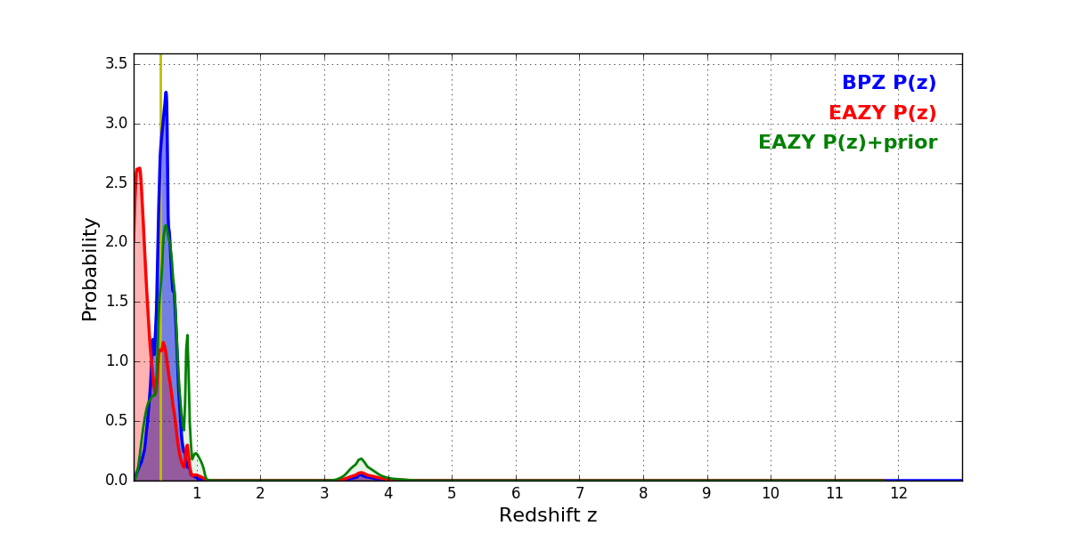 In P(z) plots: Yellow lines mark the cluster redshift z = 0.425,