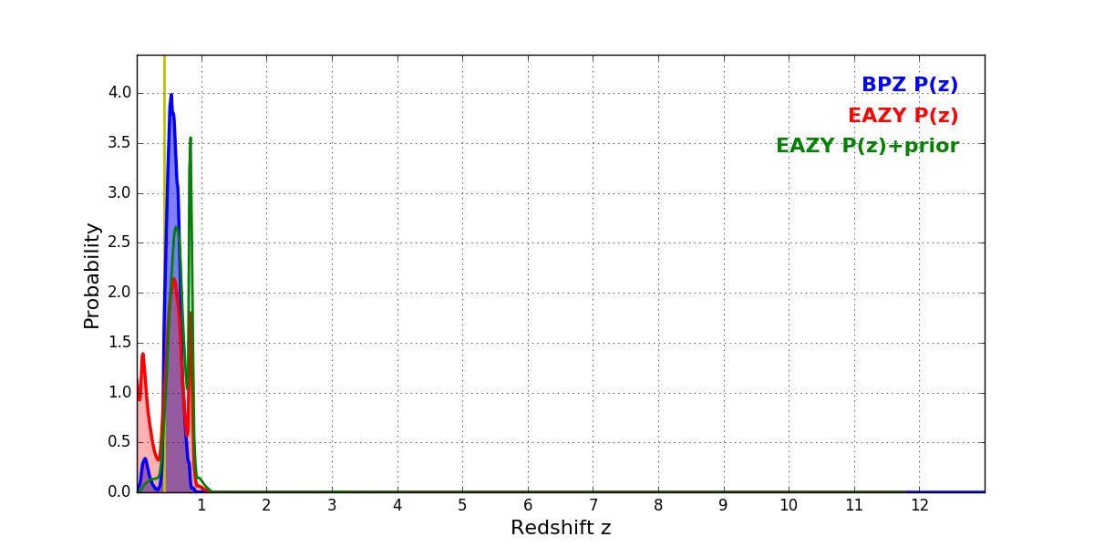 In P(z) plots: Yellow lines mark the cluster redshift z = 0.425,