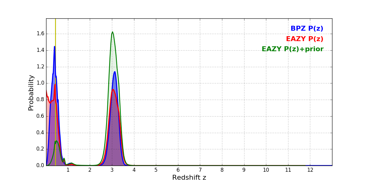 In P(z) plots: Yellow lines mark the cluster redshift z = 0.425,