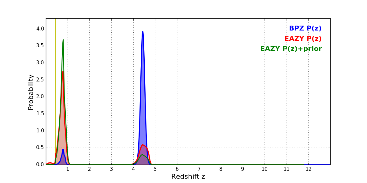 In P(z) plots: Yellow lines mark the cluster redshift z = 0.425,