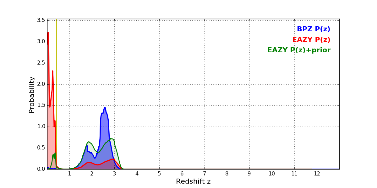 In P(z) plots: Yellow lines mark the cluster redshift z = 0.425,