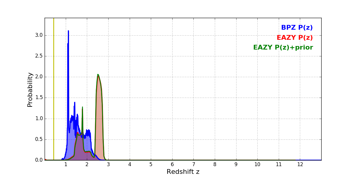 In P(z) plots: Yellow lines mark the cluster redshift z = 0.425,