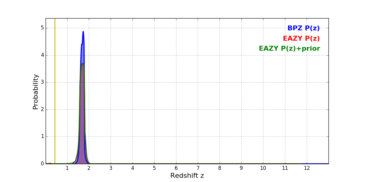 In P(z) plots: Yellow lines mark the cluster redshift z = 0.425,