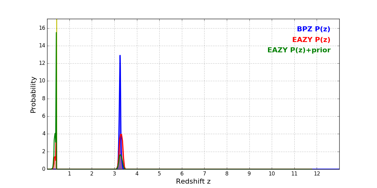 In P(z) plots: Yellow lines mark the cluster redshift z = 0.425,
