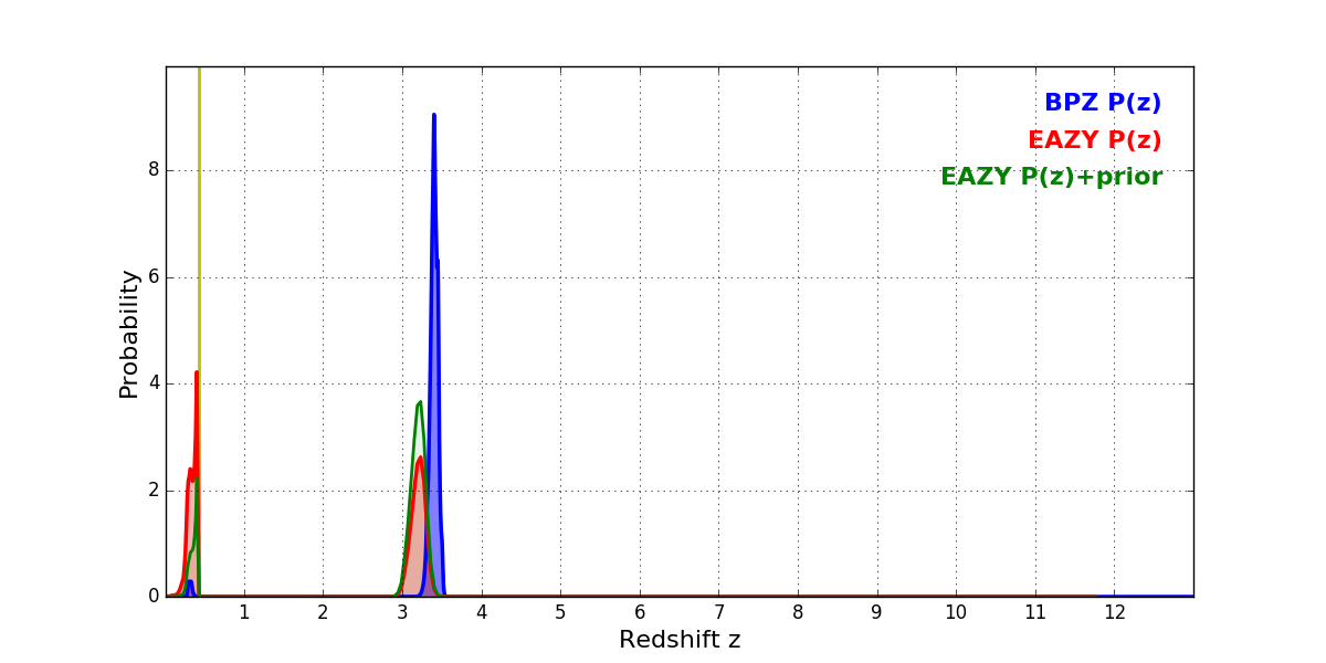 In P(z) plots: Yellow lines mark the cluster redshift z = 0.425,