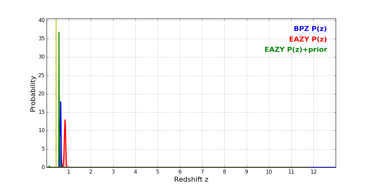 In P(z) plots: Yellow lines mark the cluster redshift z = 0.425,