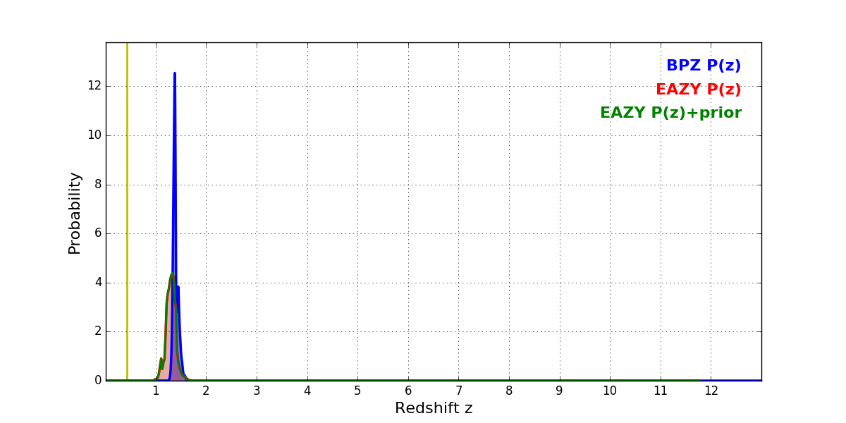 In P(z) plots: Yellow lines mark the cluster redshift z = 0.425,
