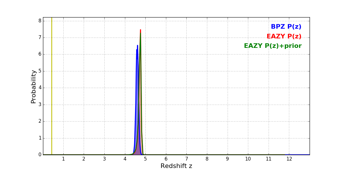 In P(z) plots: Yellow lines mark the cluster redshift z = 0.425,