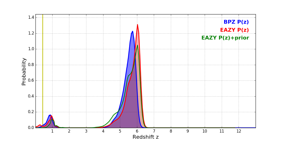In P(z) plots: Yellow lines mark the cluster redshift z = 0.425,