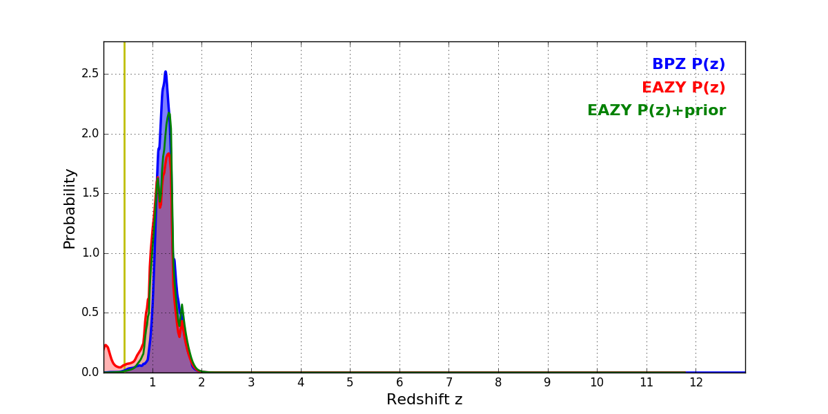 In P(z) plots: Yellow lines mark the cluster redshift z = 0.425,