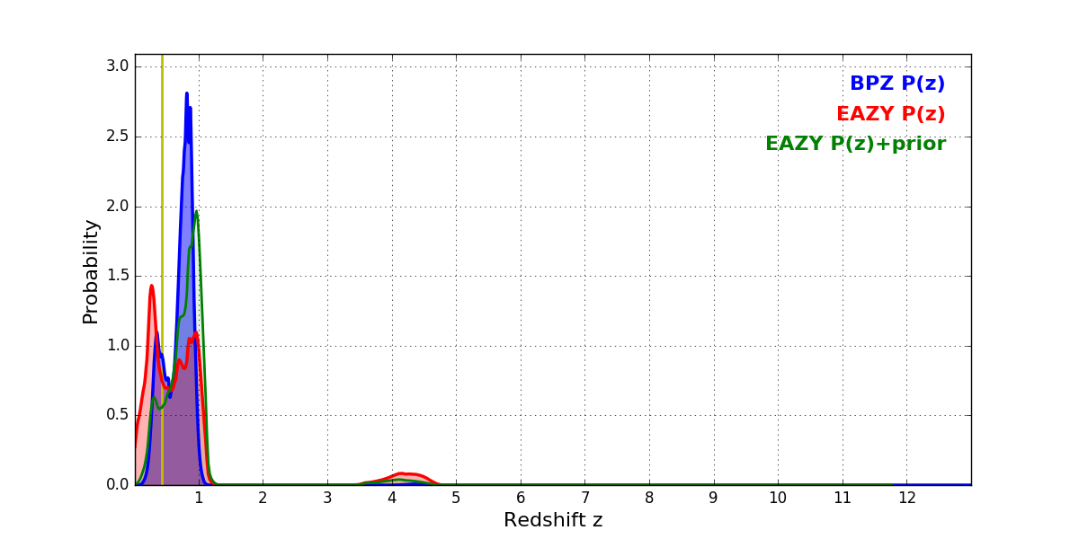 In P(z) plots: Yellow lines mark the cluster redshift z = 0.425,