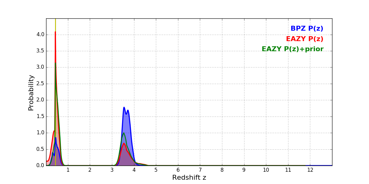 In P(z) plots: Yellow lines mark the cluster redshift z = 0.425,