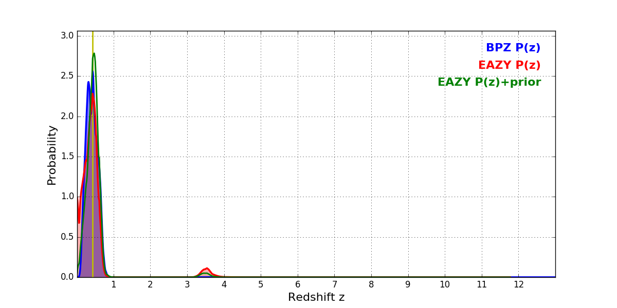 In P(z) plots: Yellow lines mark the cluster redshift z = 0.425,