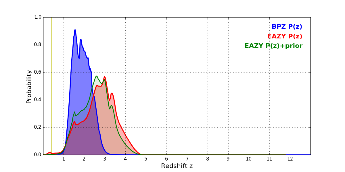 In P(z) plots: Yellow lines mark the cluster redshift z = 0.425,