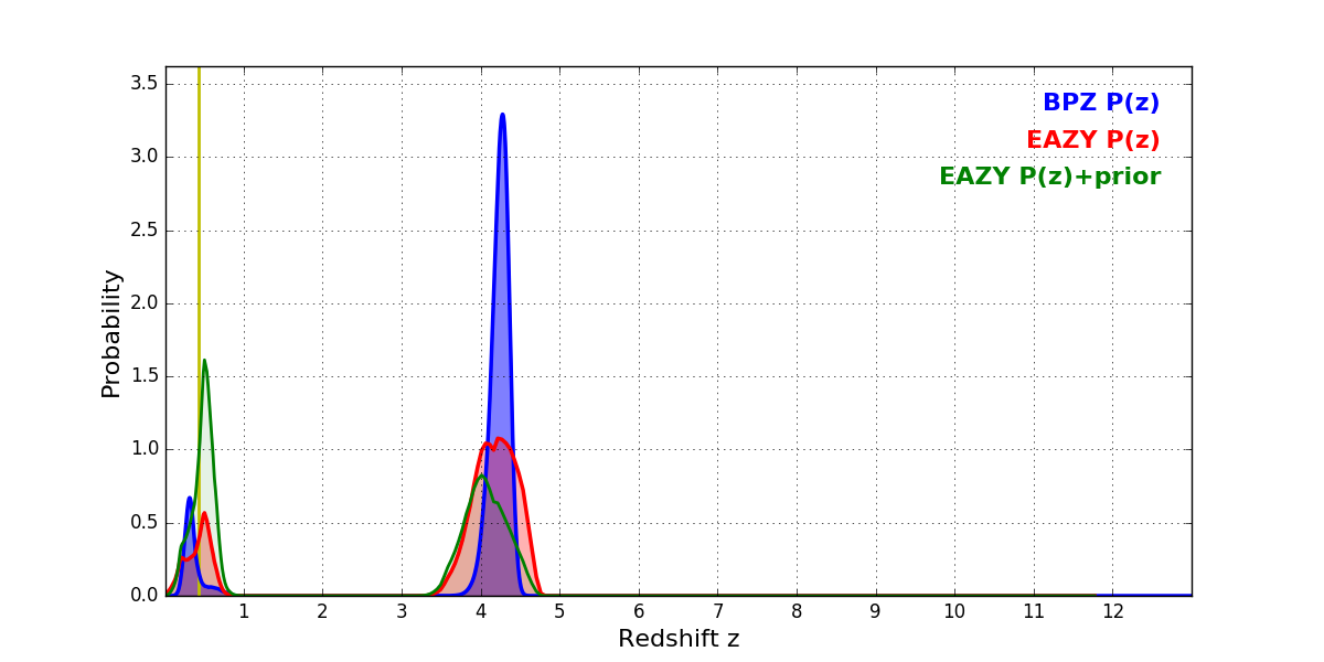 In P(z) plots: Yellow lines mark the cluster redshift z = 0.425,