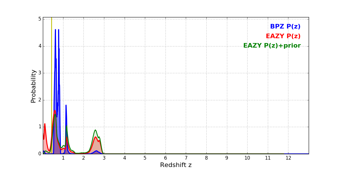 In P(z) plots: Yellow lines mark the cluster redshift z = 0.425,
