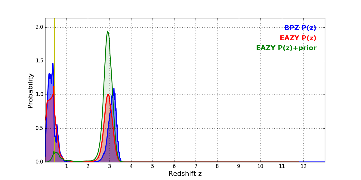 In P(z) plots: Yellow lines mark the cluster redshift z = 0.425,