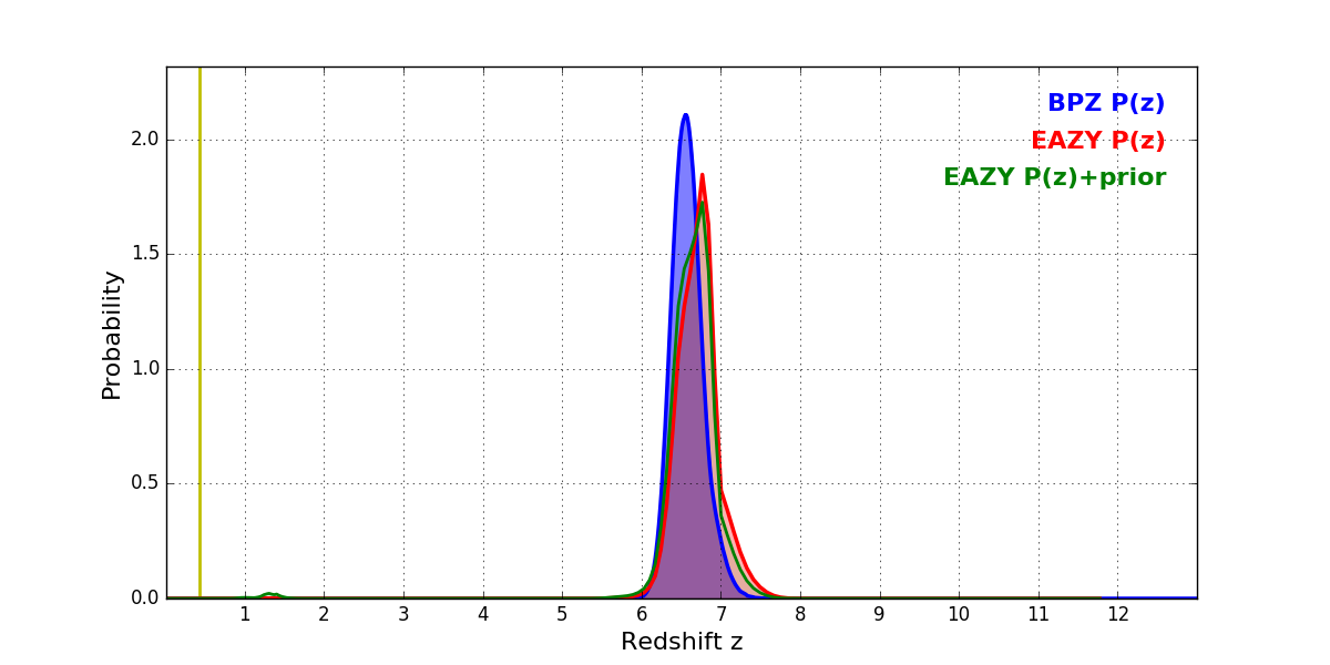 In P(z) plots: Yellow lines mark the cluster redshift z = 0.425,