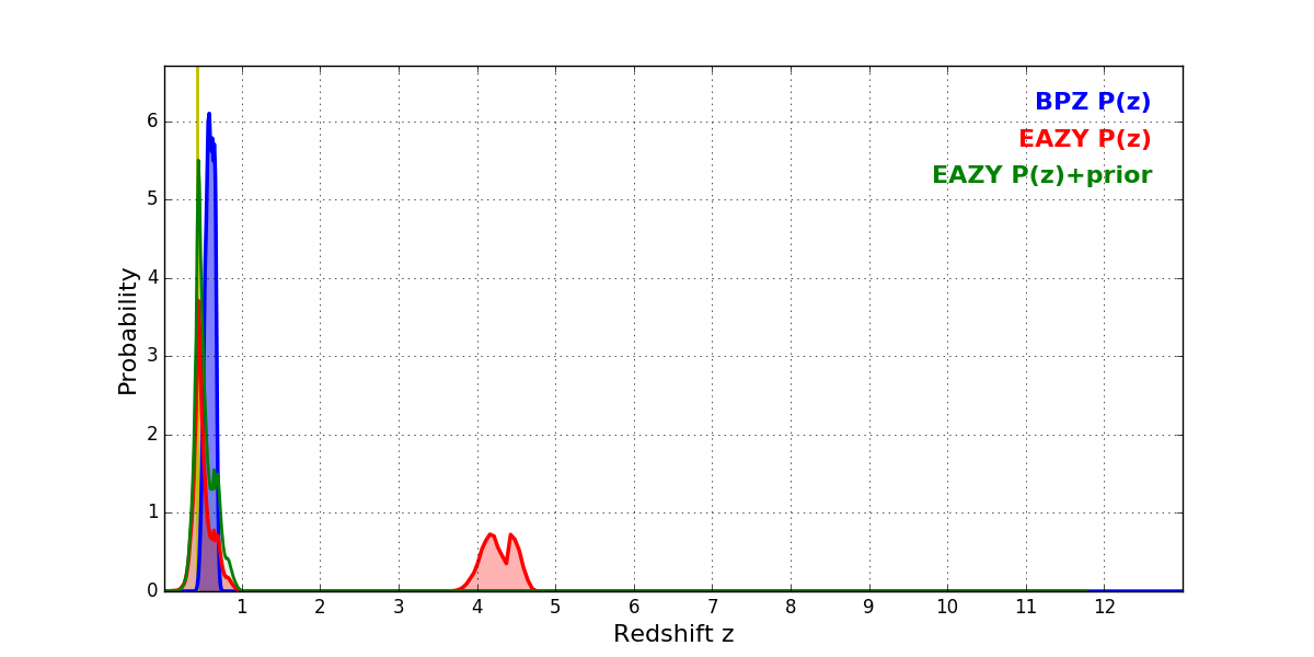In P(z) plots: Yellow lines mark the cluster redshift z = 0.425,