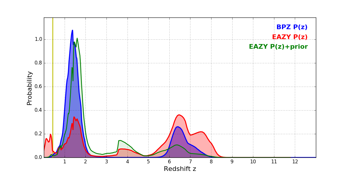 In P(z) plots: Yellow lines mark the cluster redshift z = 0.425,