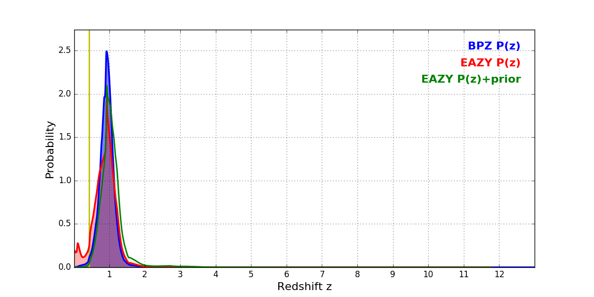 In P(z) plots: Yellow lines mark the cluster redshift z = 0.425,