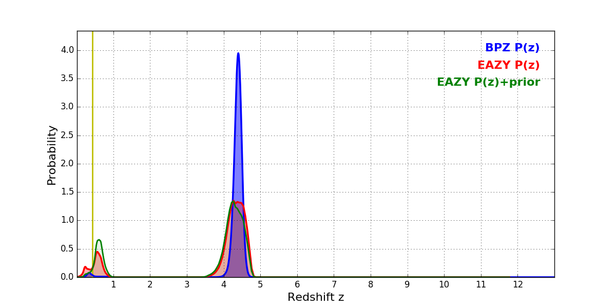 In P(z) plots: Yellow lines mark the cluster redshift z = 0.425,