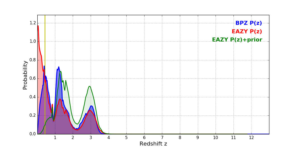 In P(z) plots: Yellow lines mark the cluster redshift z = 0.425,