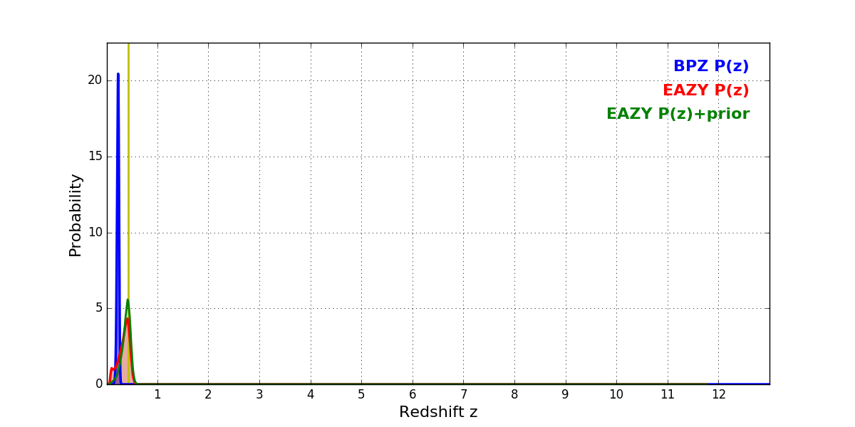 In P(z) plots: Yellow lines mark the cluster redshift z = 0.425,
