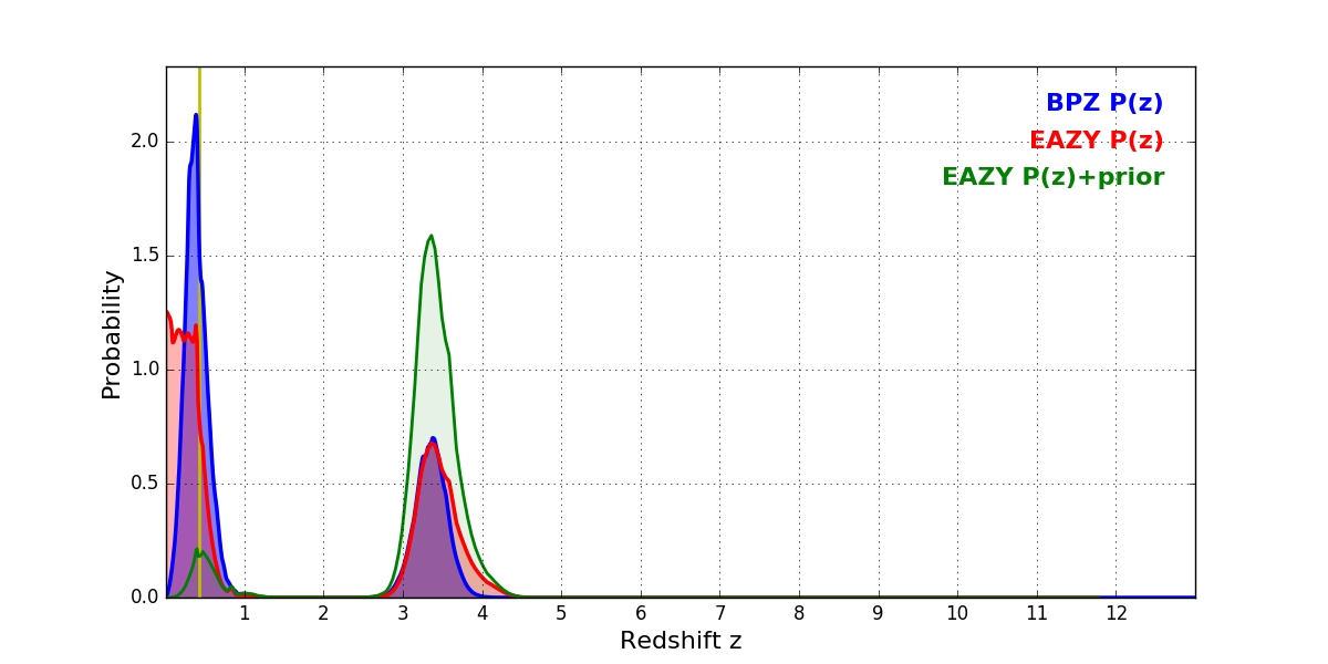 In P(z) plots: Yellow lines mark the cluster redshift z = 0.425,