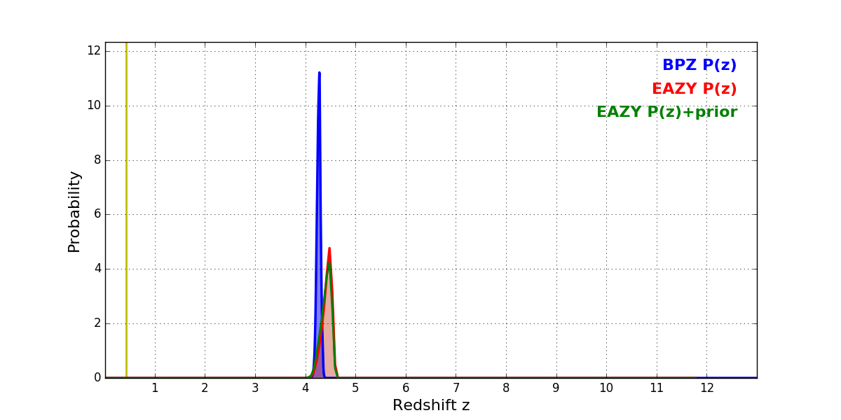 In P(z) plots: Yellow lines mark the cluster redshift z = 0.425,