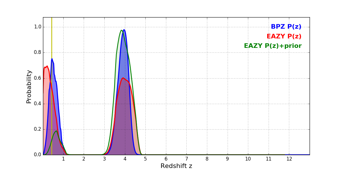 In P(z) plots: Yellow lines mark the cluster redshift z = 0.425,