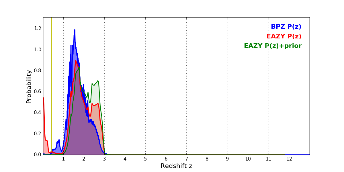 In P(z) plots: Yellow lines mark the cluster redshift z = 0.425,