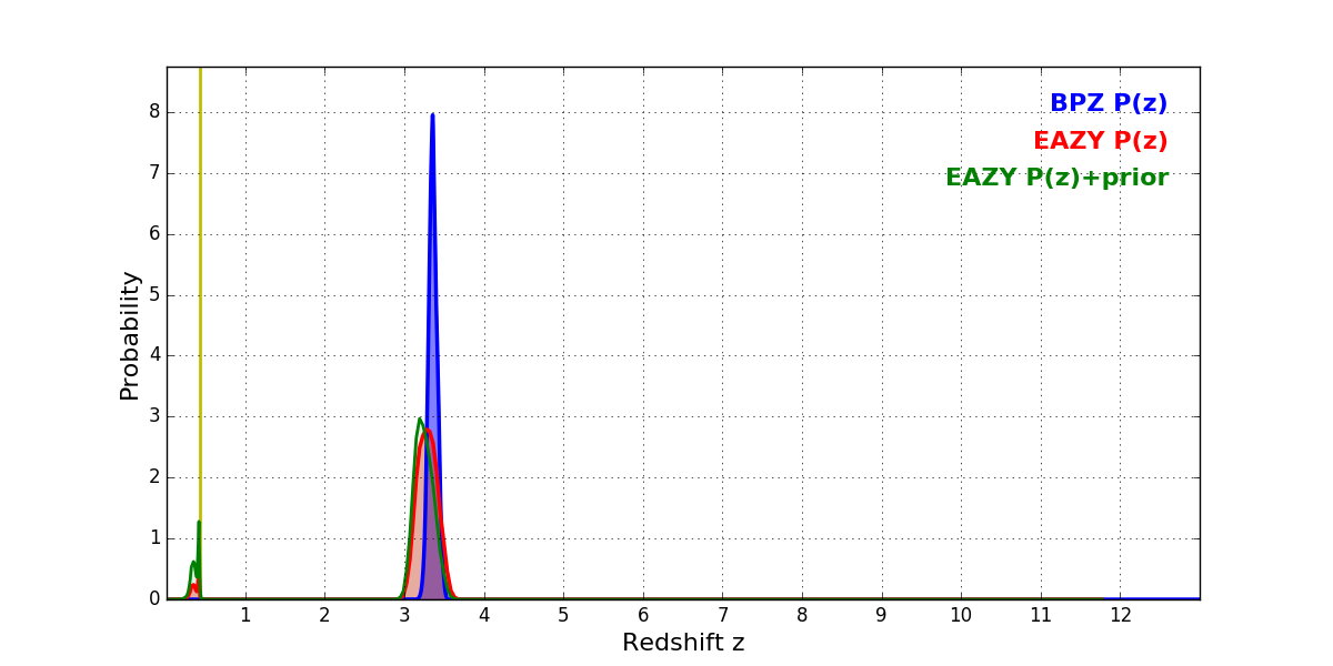 In P(z) plots: Yellow lines mark the cluster redshift z = 0.425,