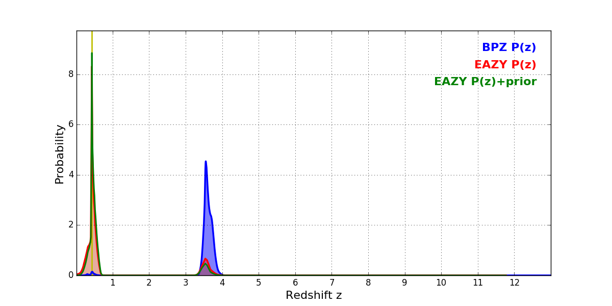 In P(z) plots: Yellow lines mark the cluster redshift z = 0.425,
