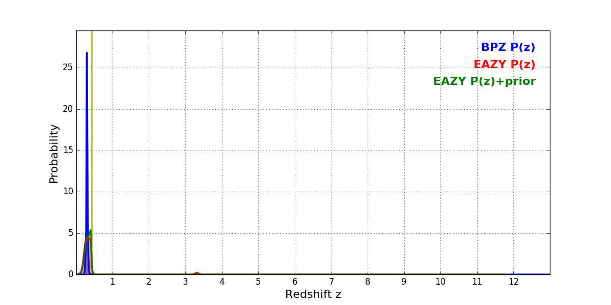 In P(z) plots: Yellow lines mark the cluster redshift z = 0.425,
