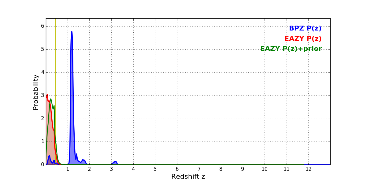 In P(z) plots: Yellow lines mark the cluster redshift z = 0.425,