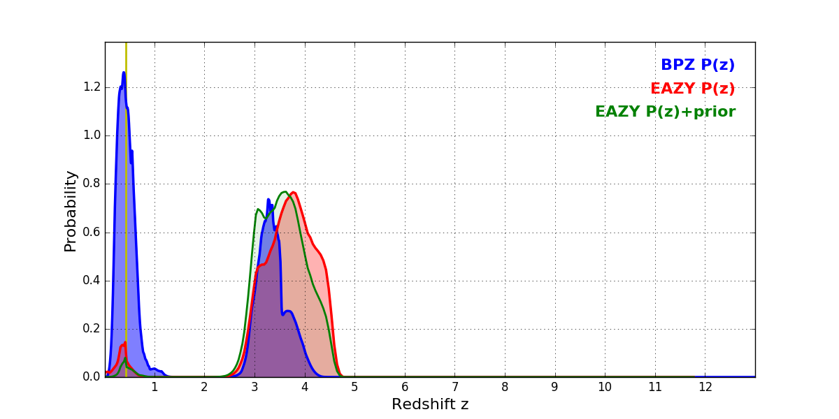 In P(z) plots: Yellow lines mark the cluster redshift z = 0.425,