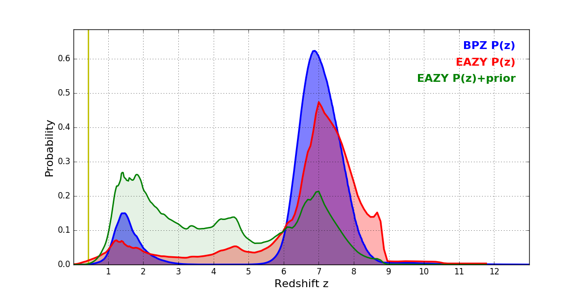 In P(z) plots: Yellow lines mark the cluster redshift z = 0.425,