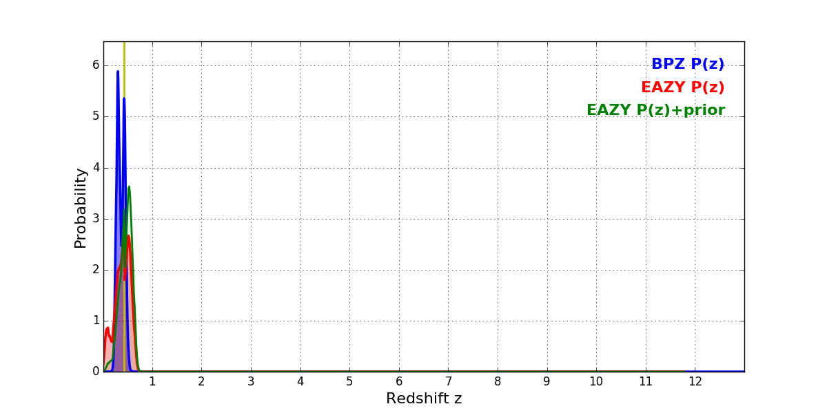 In P(z) plots: Yellow lines mark the cluster redshift z = 0.425,