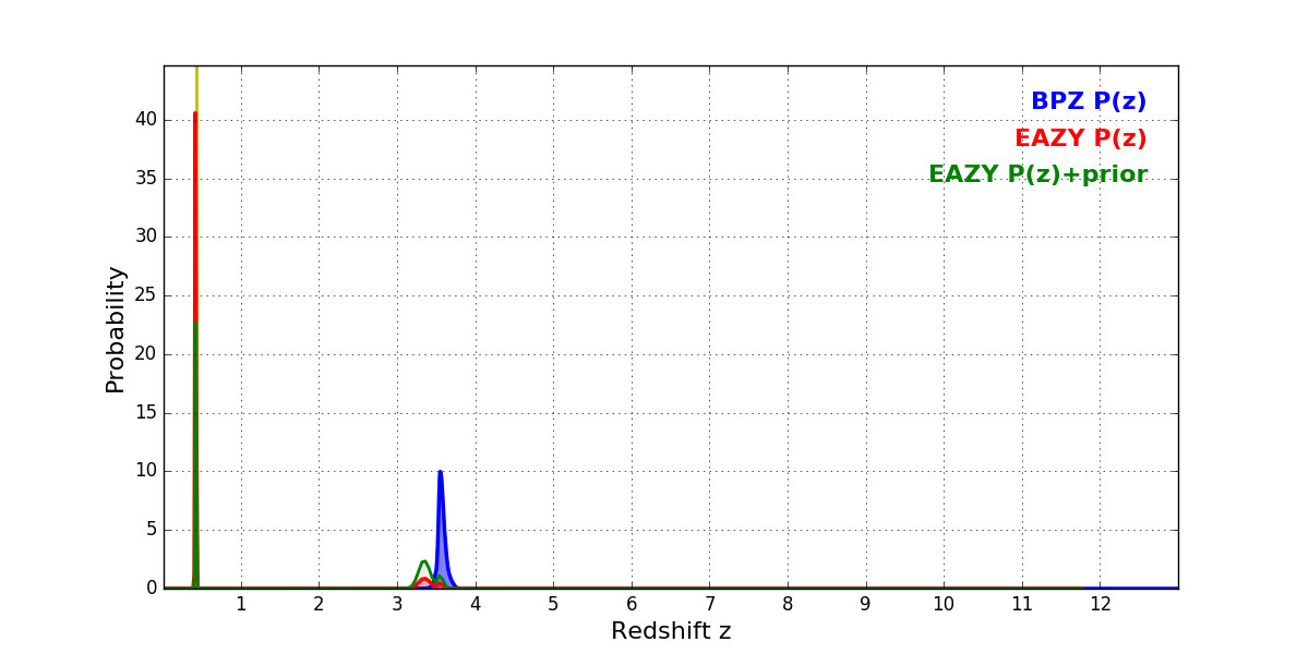 In P(z) plots: Yellow lines mark the cluster redshift z = 0.425,