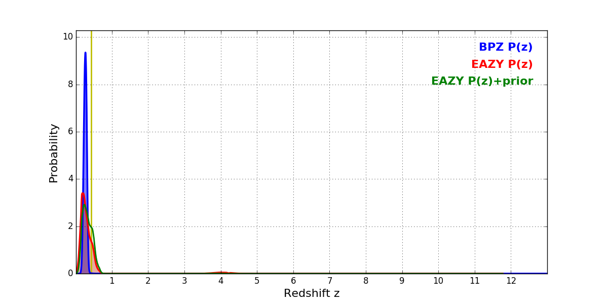 In P(z) plots: Yellow lines mark the cluster redshift z = 0.425,