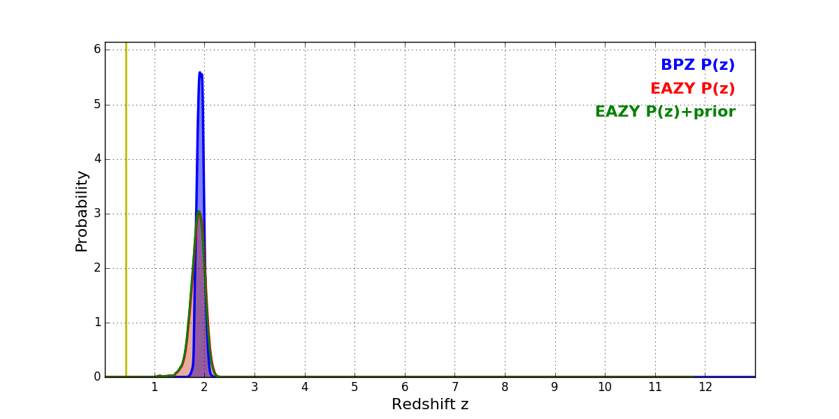 In P(z) plots: Yellow lines mark the cluster redshift z = 0.425,